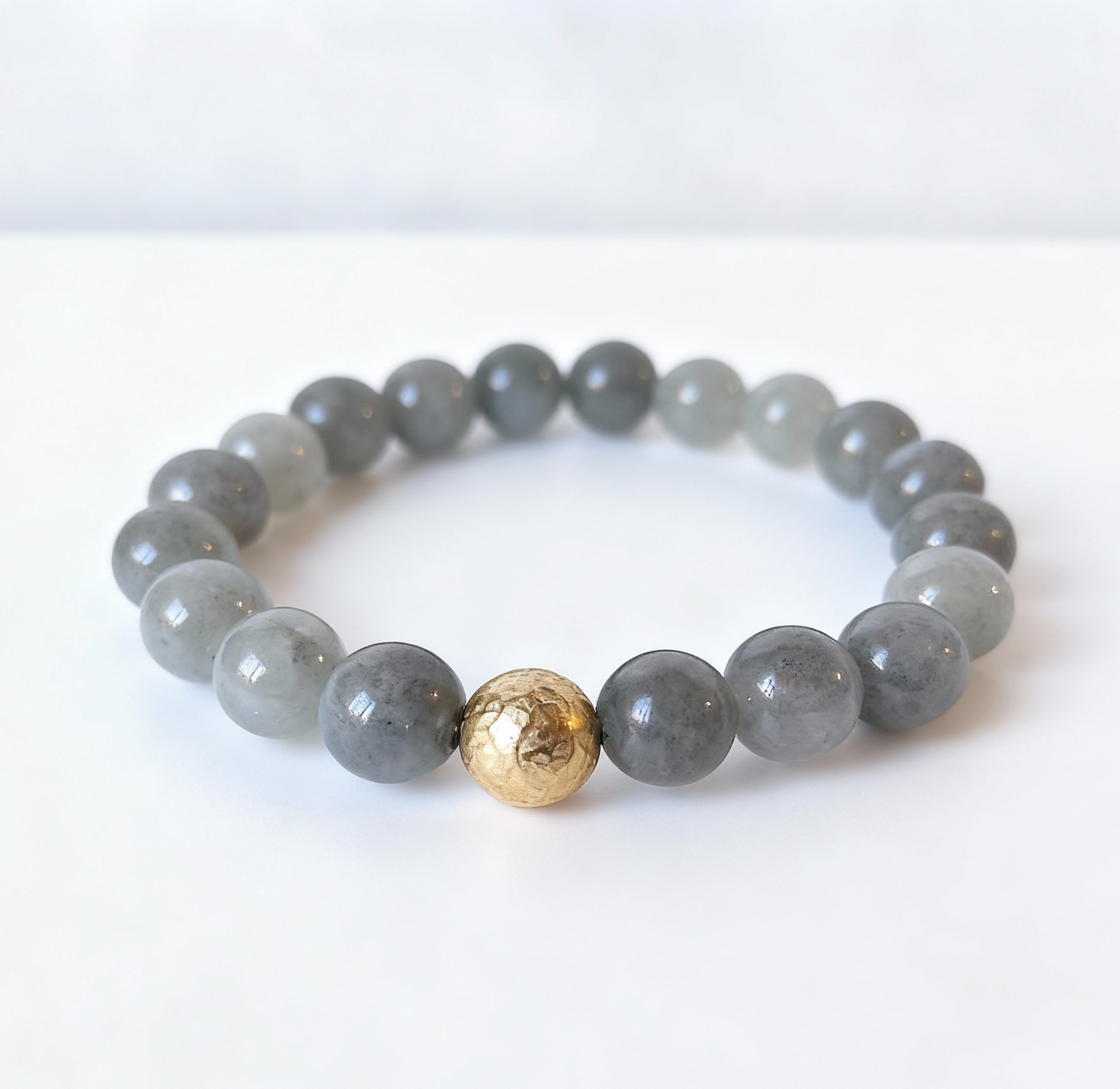 The stretch design ensures a comfortable, one-size-fits-most fit, while a single hammered gold-plated accent bead provides a captivating focal point, adding a touch of contemporary elegance and warmth.