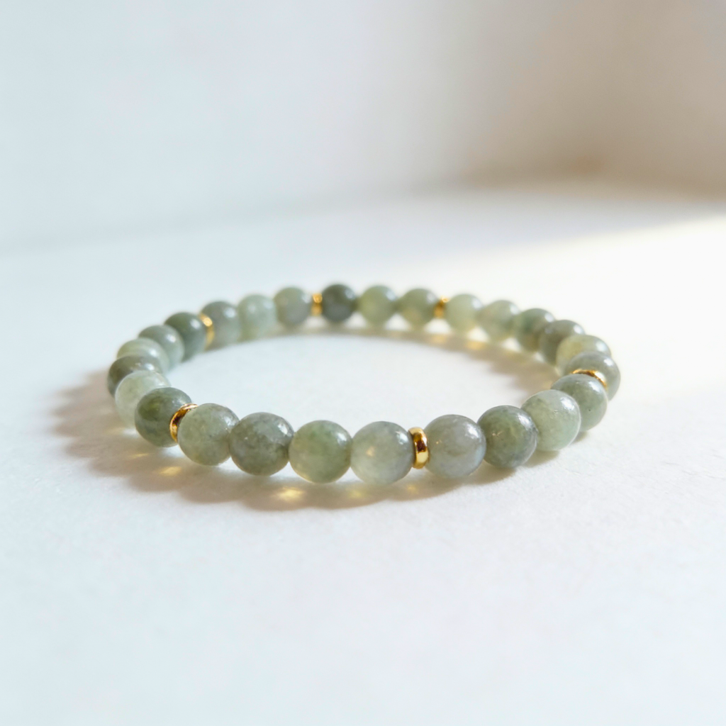 Discover the gentle power and timeless beauty of our Burmese Jade Mini Bracelet. This delicate piece features petite, smooth, and highly polished 6mm Burmese Jade beads, revered for their luminous, soft-green color and calming energy accented with gold plated spacers.